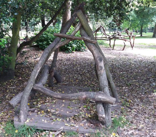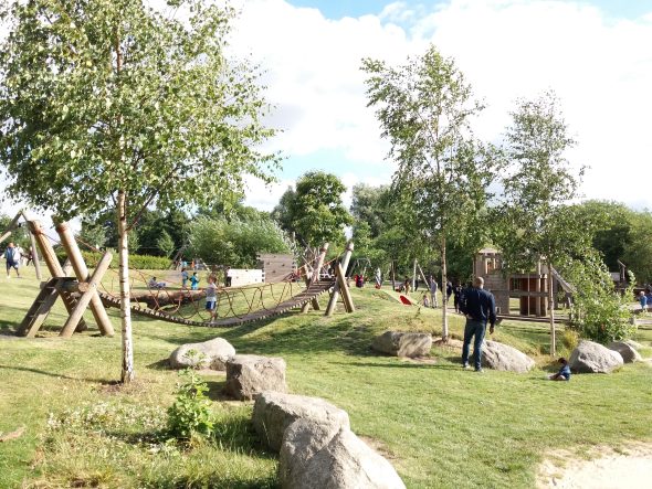 At the other end of the spectrum biophilic play is about allowing natural materials to creep back into playgrounds.  This can be as areas of grass, landscaped mounds, trees, planting, sand, bark mulch, water, timber and even mud!  Brockwell Park is a really good example of an urban park that does exactly this; the play surfaces are mainly grass, landscape mounds, sand, rocks and mud, all of this is then linked together by well designed play equipment.