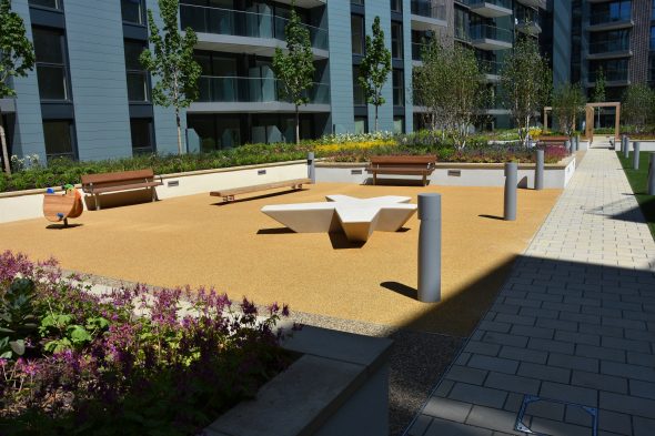 Greenwich Square, developed by Hadley Mace and built by Mace Construction, creates a new community for east Greenwich.  The £250 million project upon a 3 hectare brownfield site delivers 686 new mixed-tenure homes (50% affordable housing), a new community hub including a leisure centre, library, health centre, adult education college, reaurants and shops.  Outerspace have designed and technically delivered the entire landscape masterplan, including a public art sculpture within the central piazza.  The various phases within the scheme include: