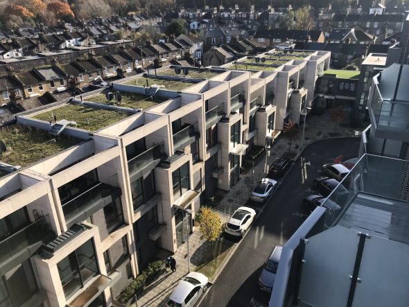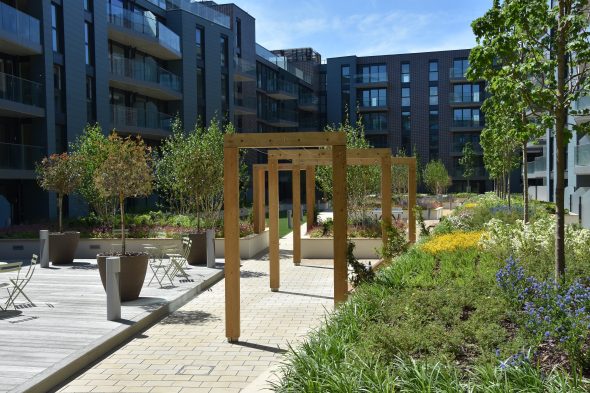 The Phase One affordable housing block has a communal garden up at first floor level above the car park.  This provides a play space for toddlers, communal seating and lush planting around the perimeter.