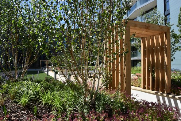 This garden was built within the first phase of the development.  It has provided the residents with a source of amenity, both to look down upon and utilise on a daily basis.  Catering for the mental health of the residents, the layout promotes opportunities for communal socialisation and a garden space for play for all ages including toddlers equipment and a flexible lawn.  Furthermore we have created a heavily planted perimeter to create a feeling of comfort within the garden and encourage residents to sit out with a minimised sense of being overlooked.
