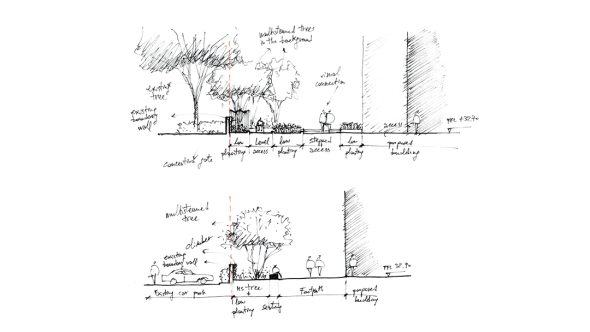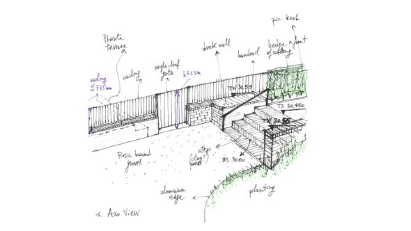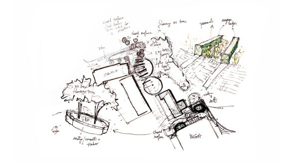 Freehand drawing can also be used for quick perspectives providing the ‘look and feel’ of a design, or annotated sections describing the horizontal and vertical relationship of the various elements.
